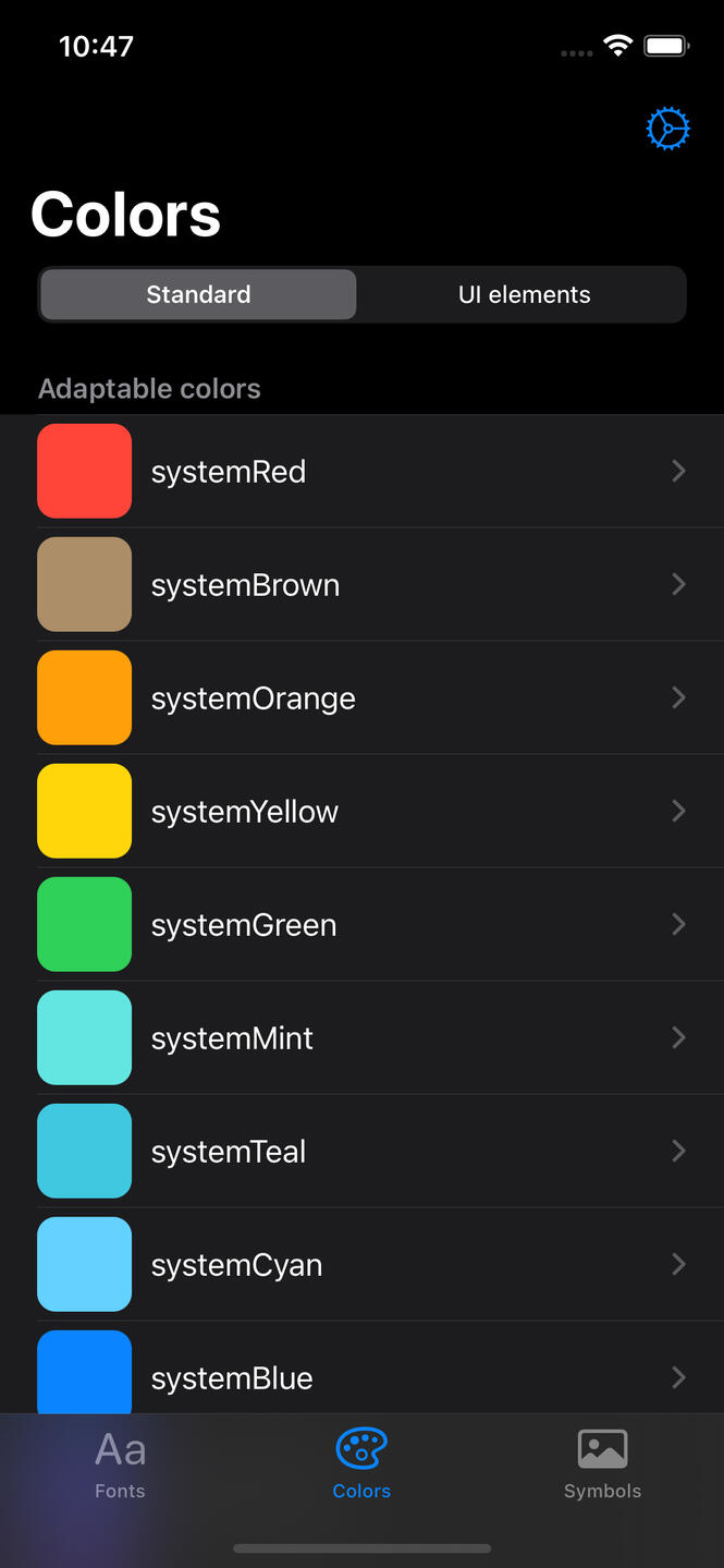 iOS app for iOS developers to visualize Apple's built in UI elements such as fonts, colors, and symbols. Toggle between light and dark mode in the app.